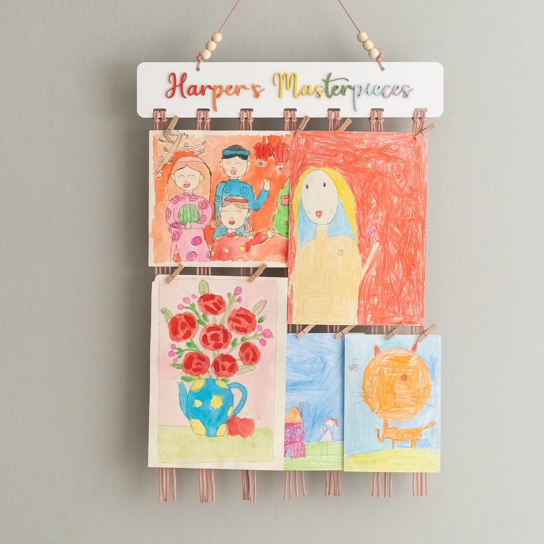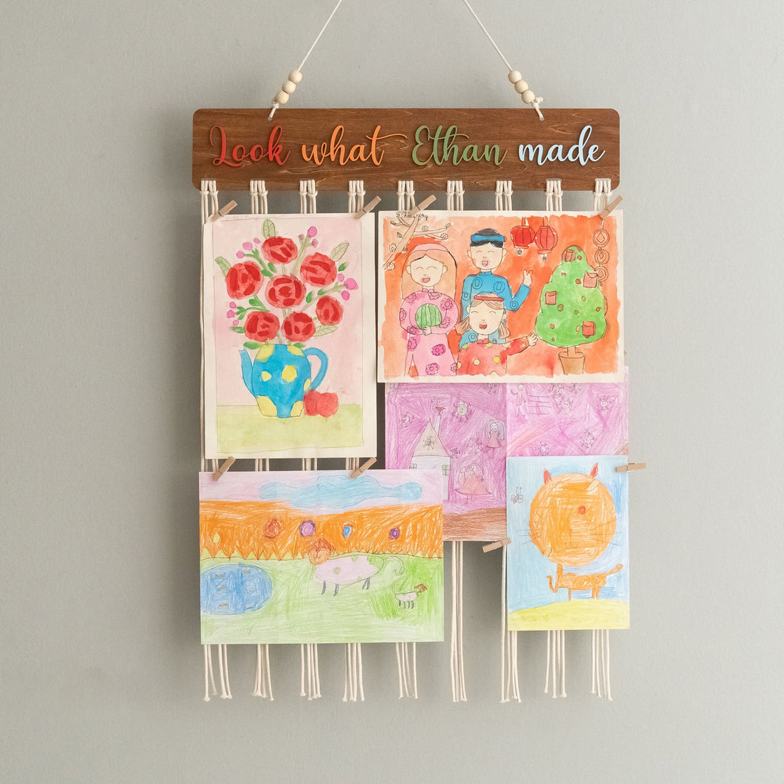 Macrame Kids Art Hanger Wood for Kids Art Display and Boho Decor I28