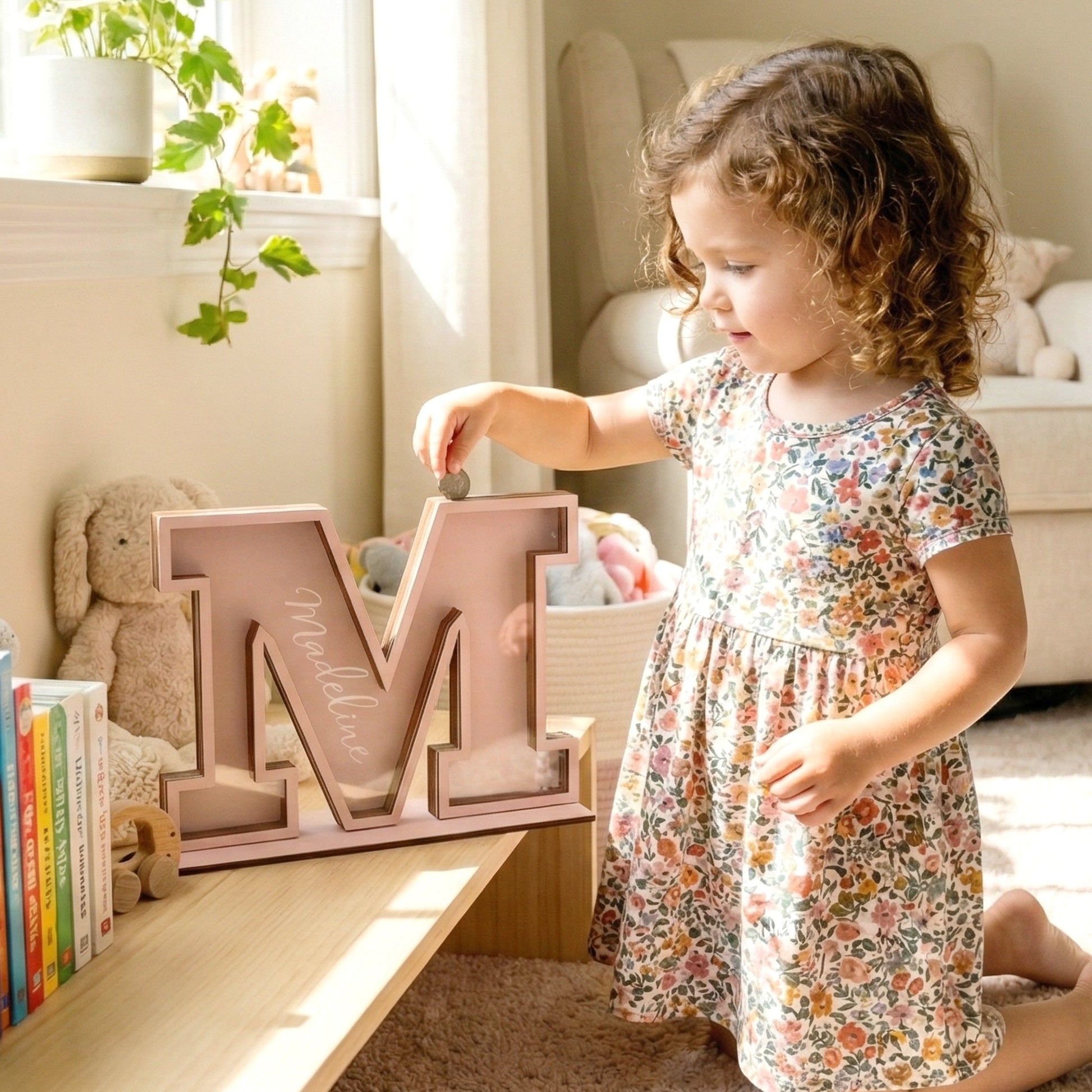 This personalized piggy bank is a charming letter shaped keepsake designed to help children save coins while adding a playful touch to their space. Crafted from wood and acrylic, each personalized letter piggy bank features a clear coin display that makes saving money fun and visual.