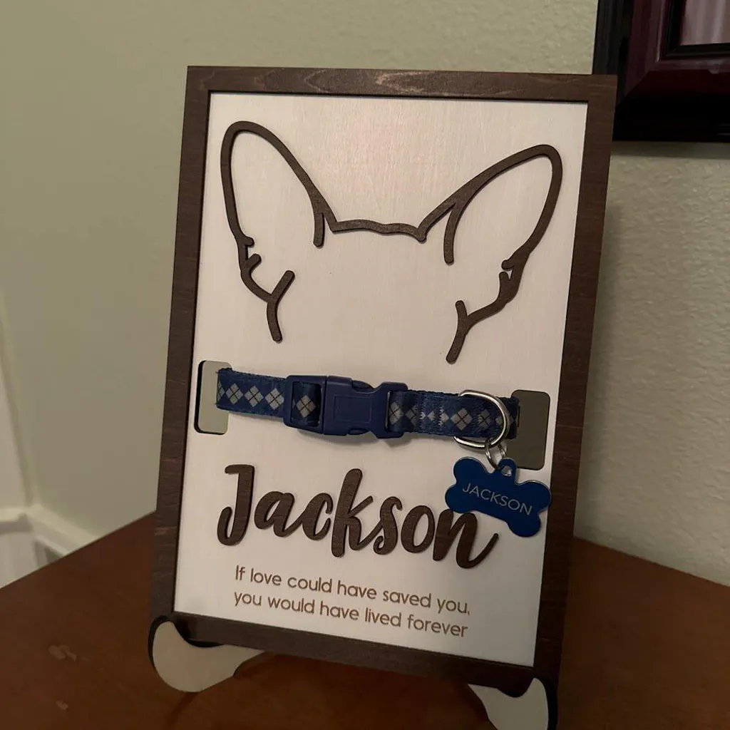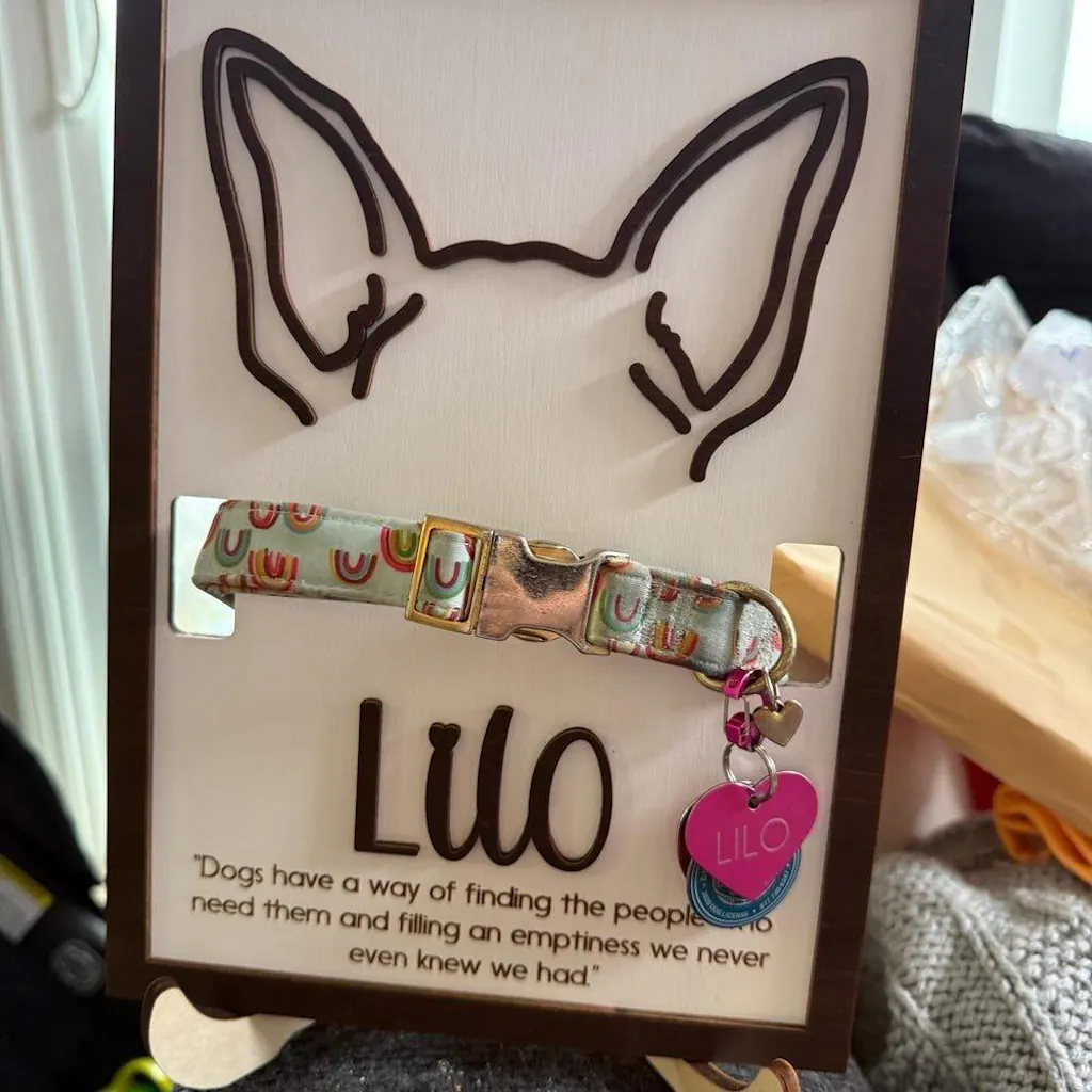 This Dog Ear Drawing Framed Wood Sign is a meaningful way to honor and remember a beloved pet. Designed to display your dog or cat collar together with a personalized ear drawing and name, it turns cherished memories into a heartfelt keepsake.