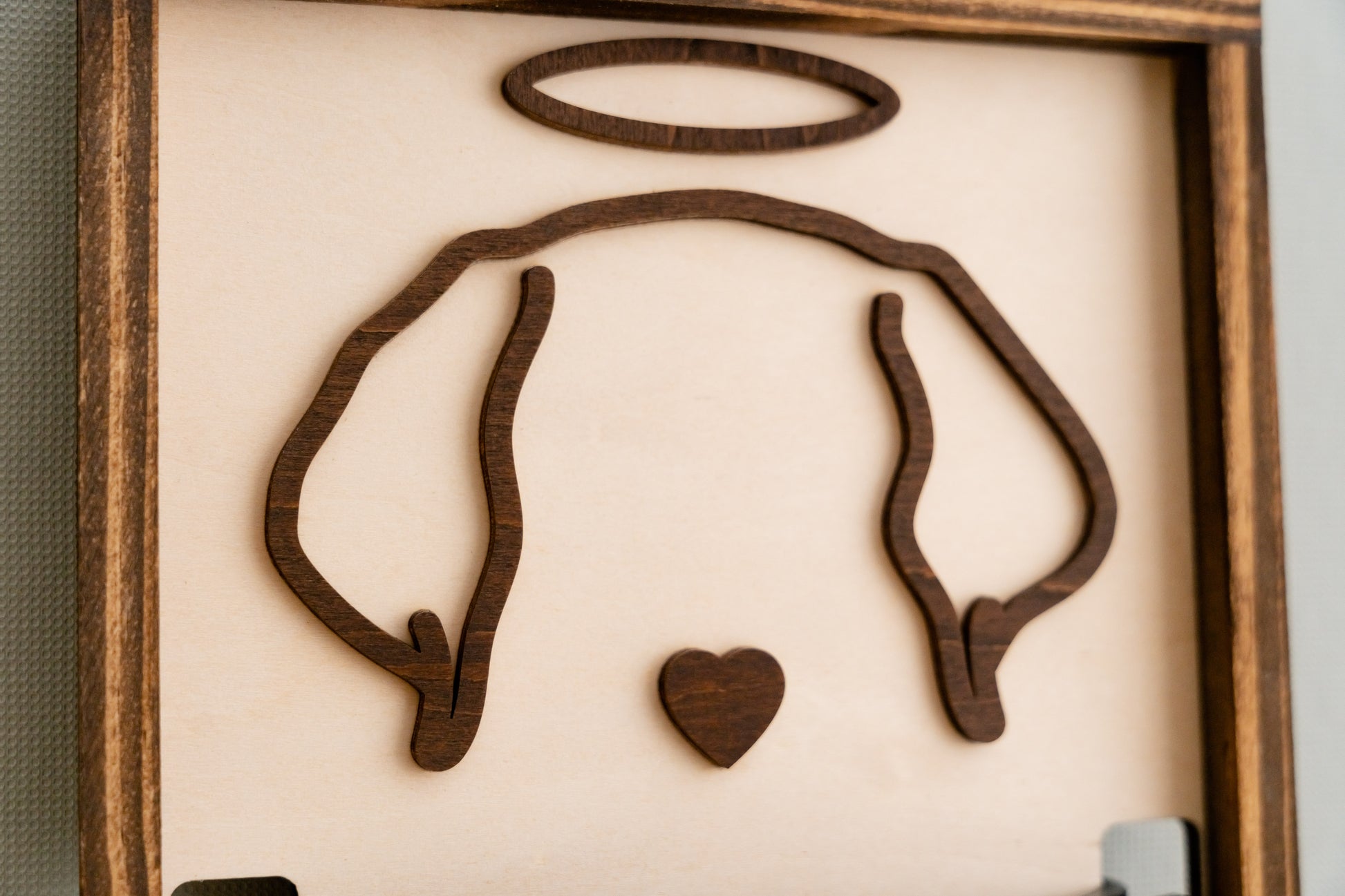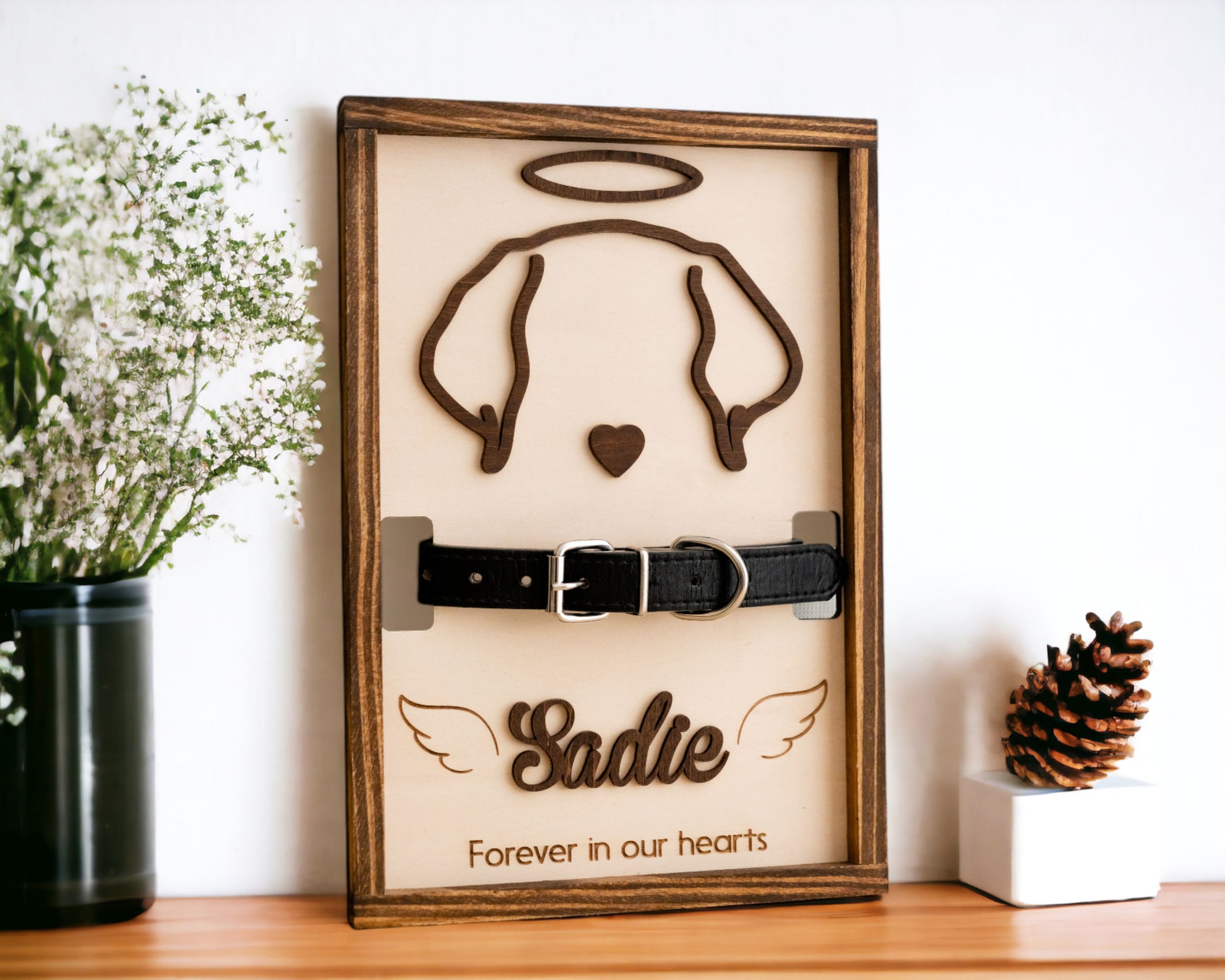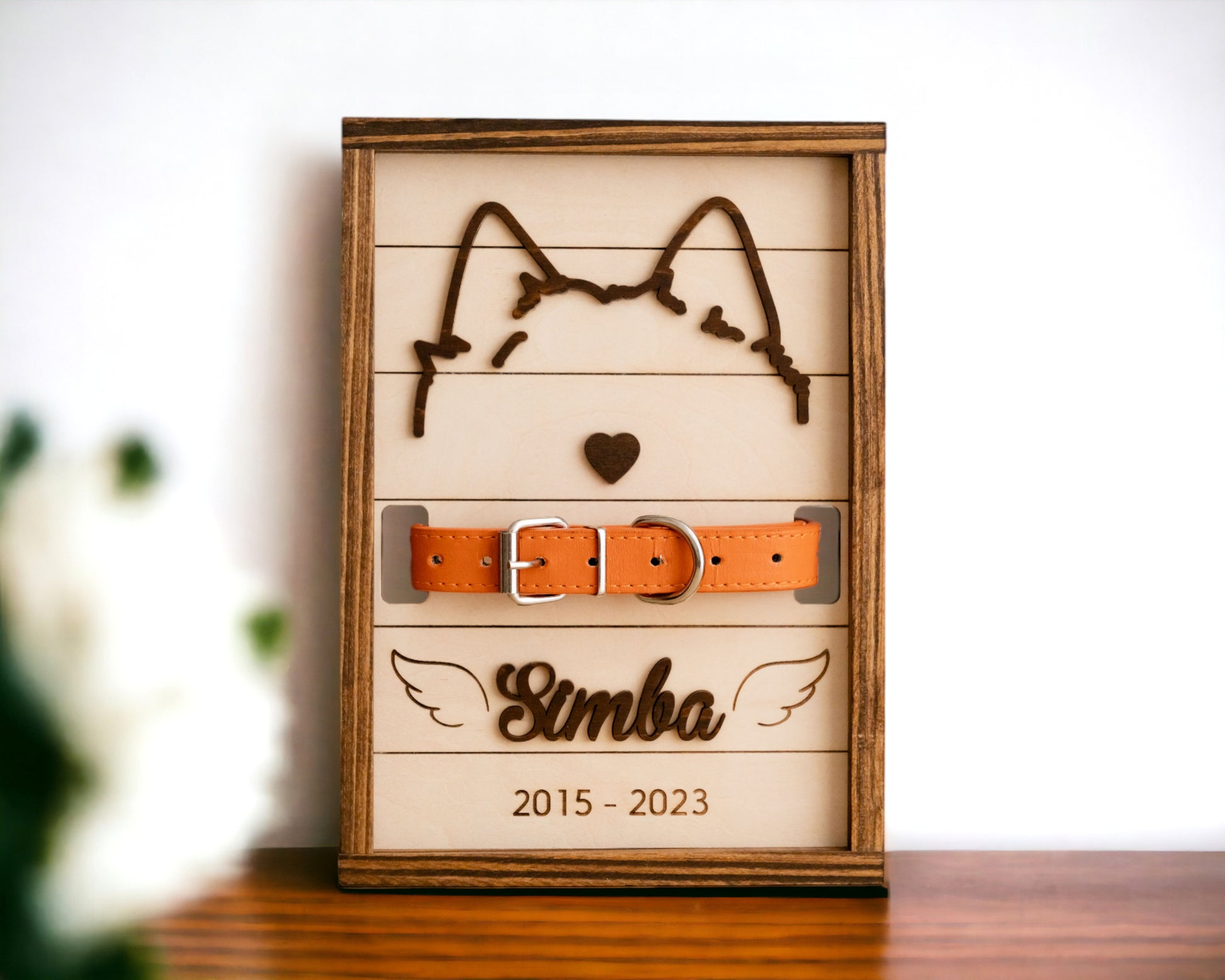 This wooden dog memorial decor features a delicate ear outline portrait as a custom pet portrait frame, capturing the unique spirit of your dog in a minimalist style. Designed to hold your pet’s collar as a dog collar keepsake frame, it transforms everyday items into meaningful remembrance pieces. As a personalized dog memorial frame, it can include your pet’s name and important dates, turning it into a lasting pet remembrance frame.