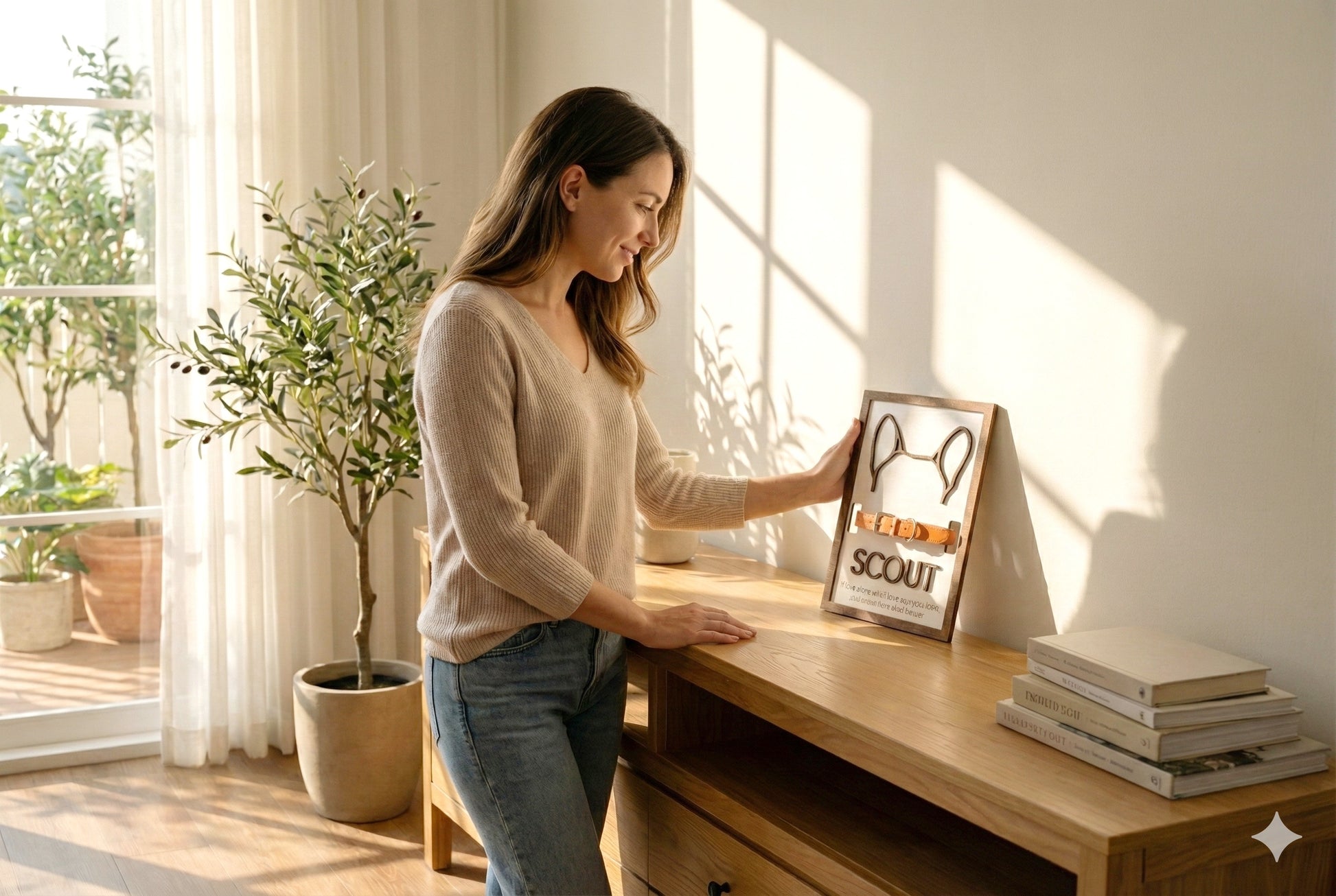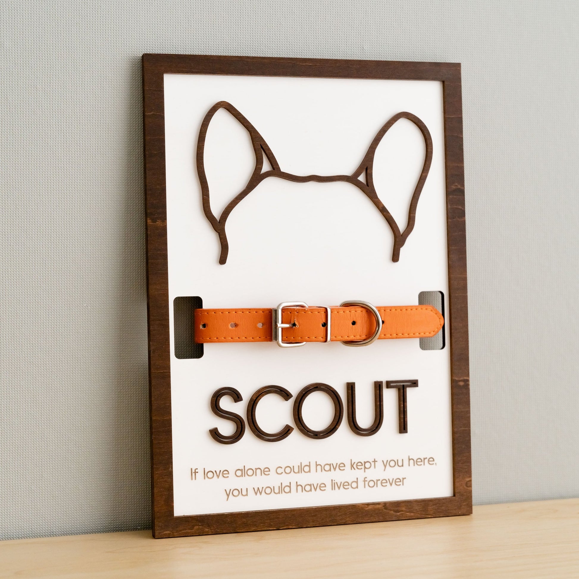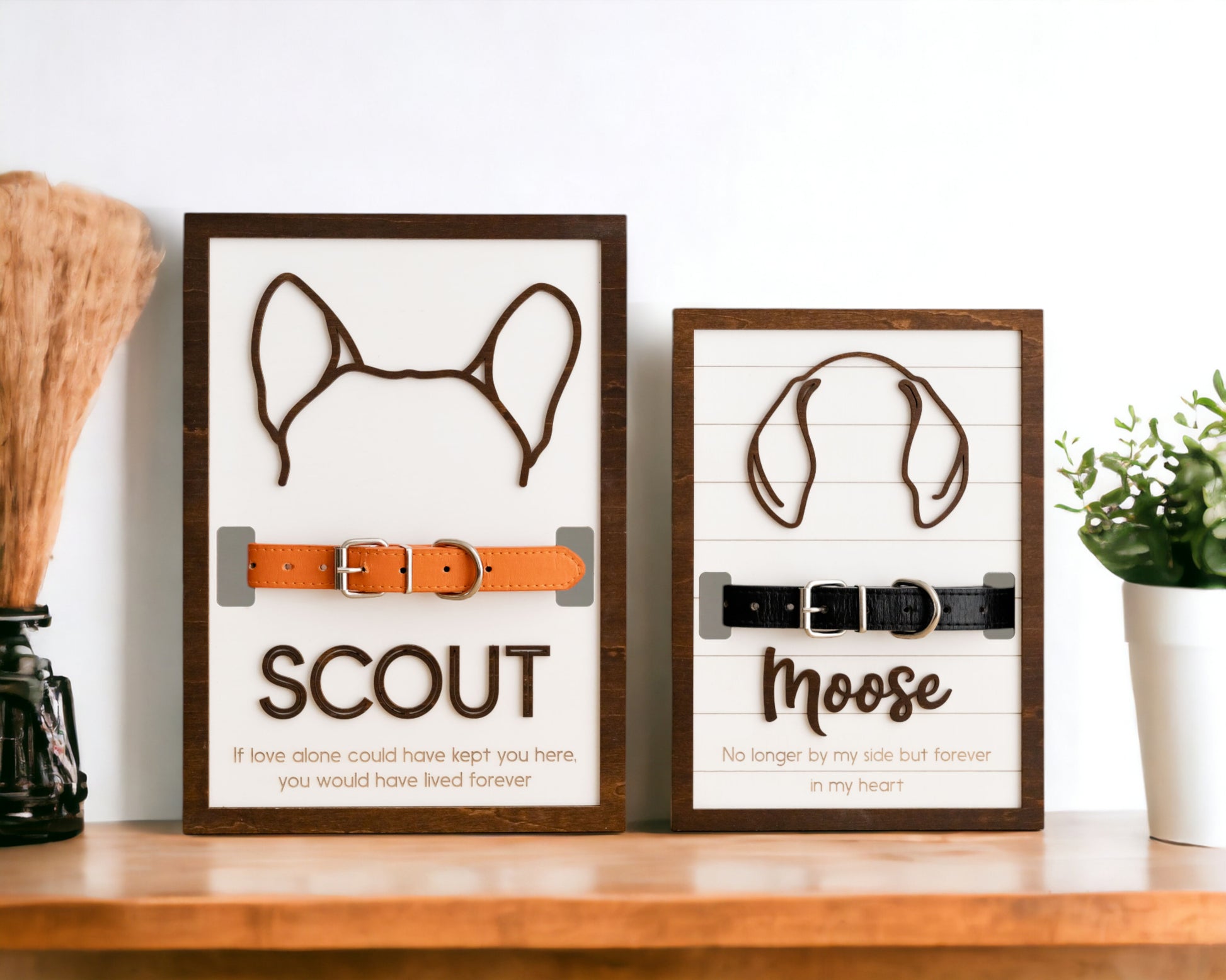 Created for pet parents, dog moms, and cat lovers, this wooden pet memorial offers comfort during times of loss. Its thoughtful design allows you to display a collar and ear drawing in a simple yet emotional way, making it a deeply personal custom pet keepsake.