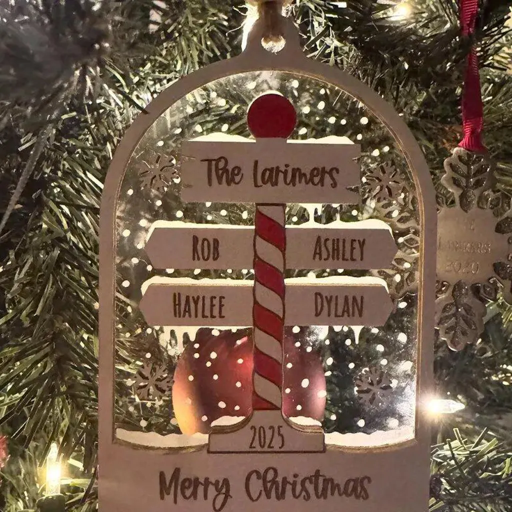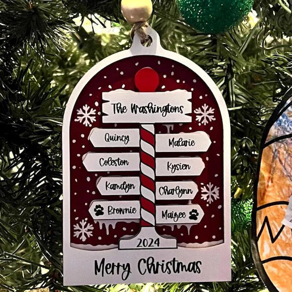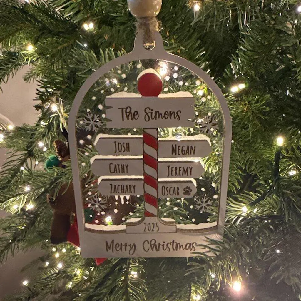 This Personalized Family Christmas Ornament is a decorative holiday ornament designed to celebrate family connections through personalized names. Crafted from wood and acrylic, it features a warm and charming layout that highlights each family member in a meaningful way.