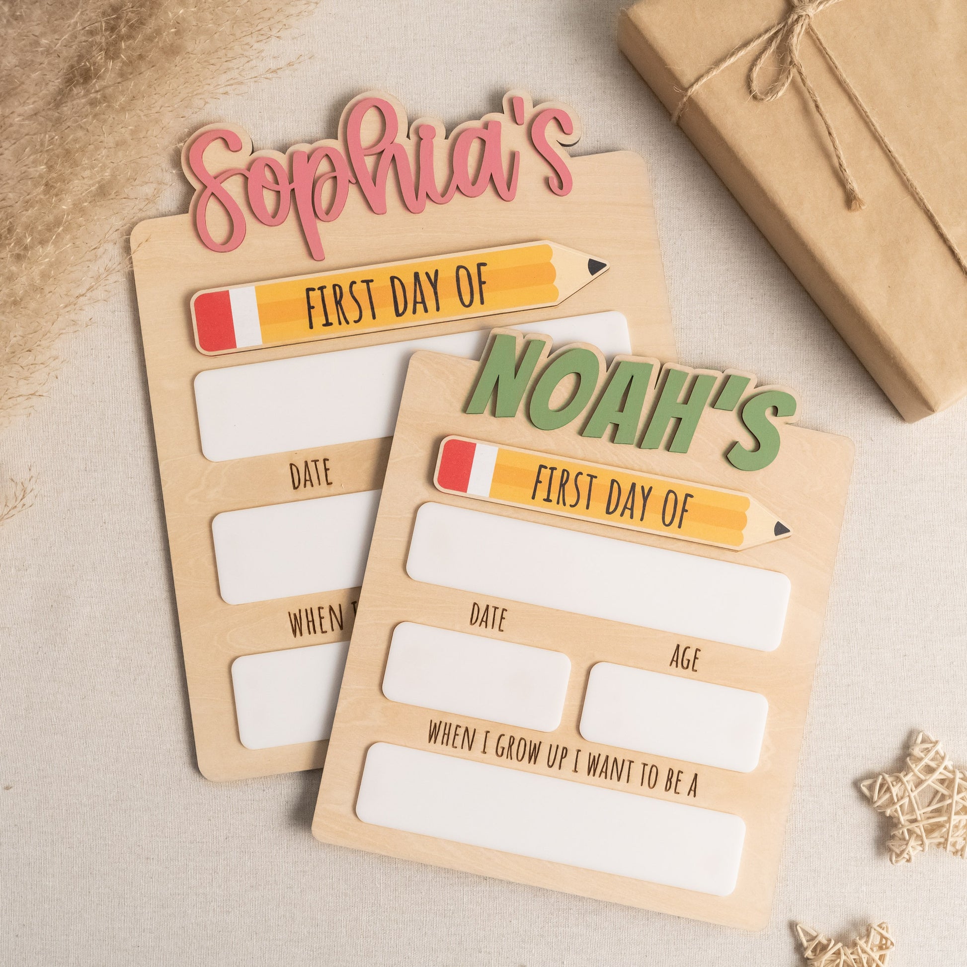 This personalized first day of school sign is a reusable photo board designed to capture meaningful school milestones year after year. Made from wood and acrylic, it features a clean modern style that fits beautifully in kids rooms classrooms or as a photo backdrop.