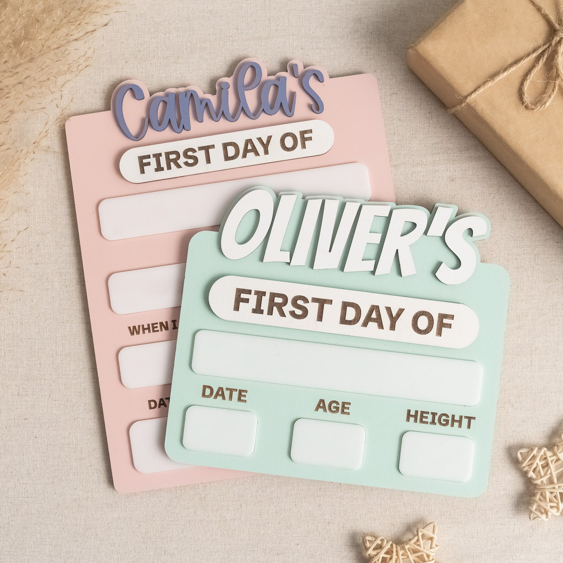 This personalized first day of school sign is a reusable wooden board designed to capture meaningful school milestones year after year. Created for children starting a new school journey, it helps parents document special moments through fun and memorable photos.
