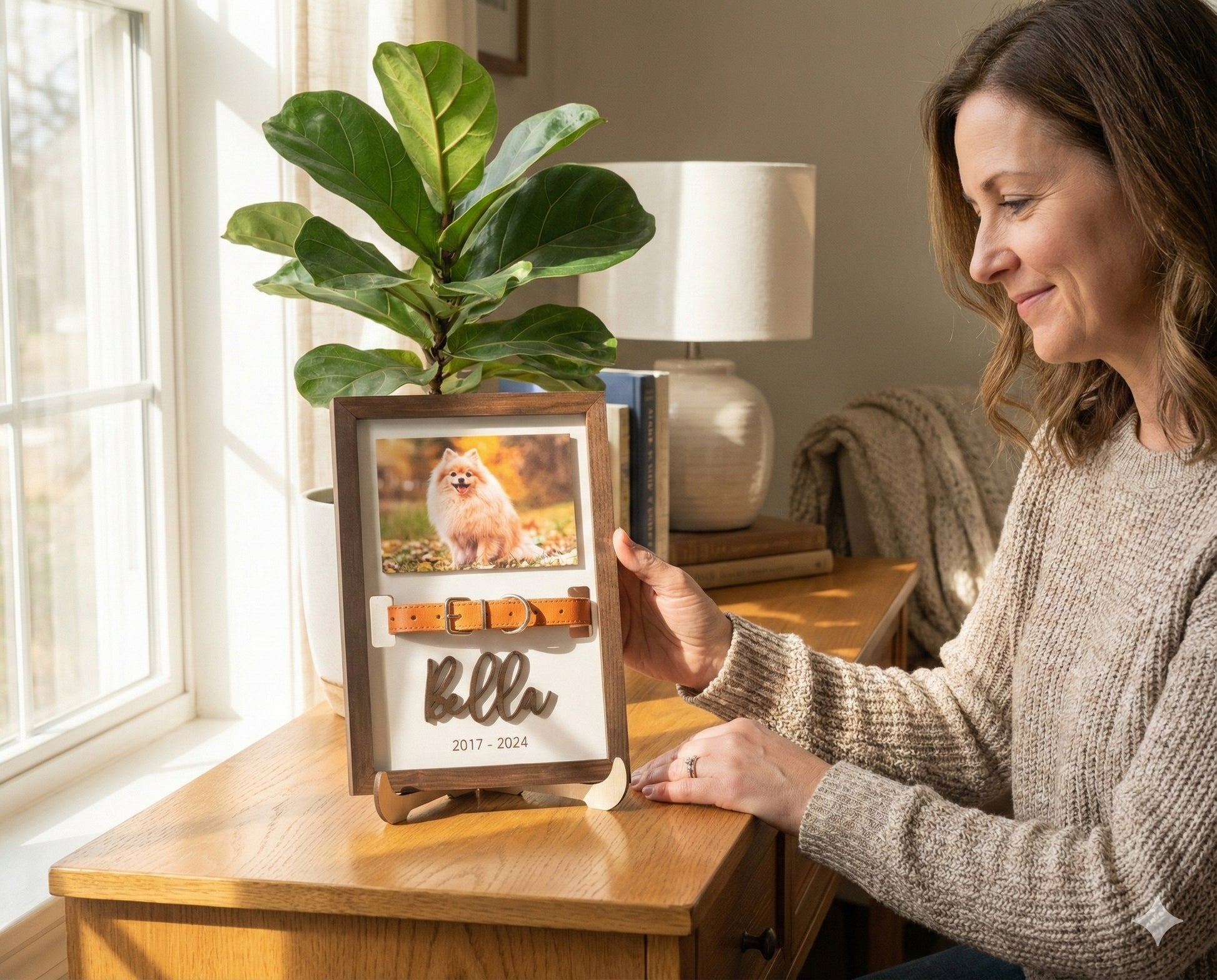 Thoughtfully made from wood, this personalized pet memorial blends a clean minimalist look with rustic charm, making it suitable for living rooms, bedrooms, offices, or entryways. It is perfect for pet parents who wish to keep their dog or cat close in spirit after loss.
