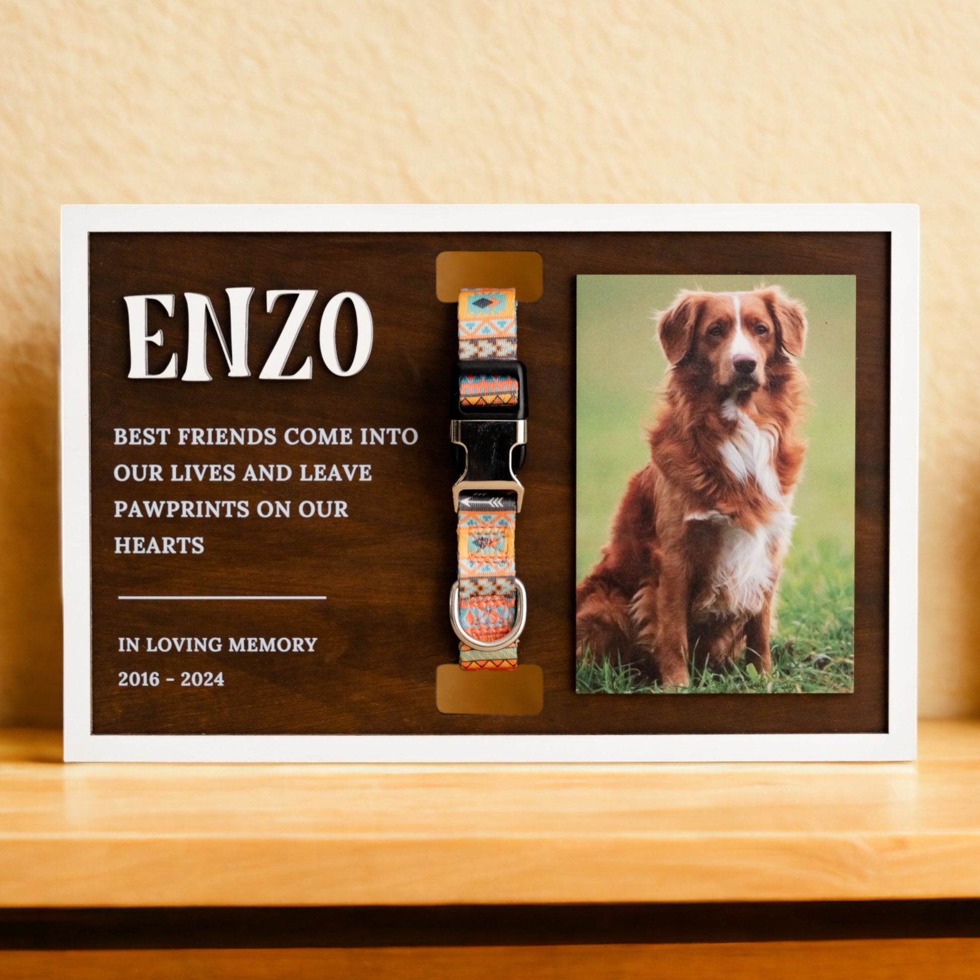 This personalized pet memorial sign is a meaningful way to honor and remember a beloved pet. Crafted from wood, it is designed to hold both a treasured photo and your pet’s collar, creating a heartfelt tabletop keepsake filled with love and memories.