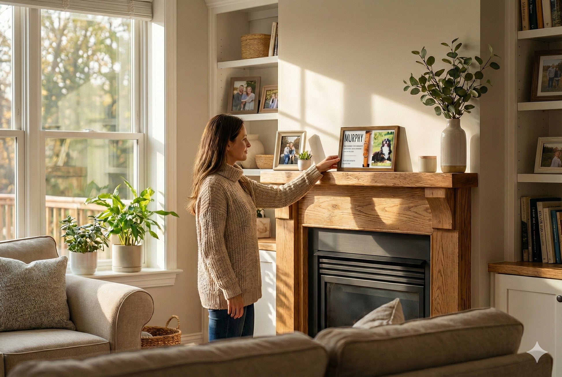 Crafted from wood with a clean and timeless design, this pet memorial photo frame fits beautifully into living rooms, bedrooms, offices, or entryways. Its balance of rustic warmth and minimalist style allows it to blend naturally with many home interiors while keeping the focus on your pet’s story.