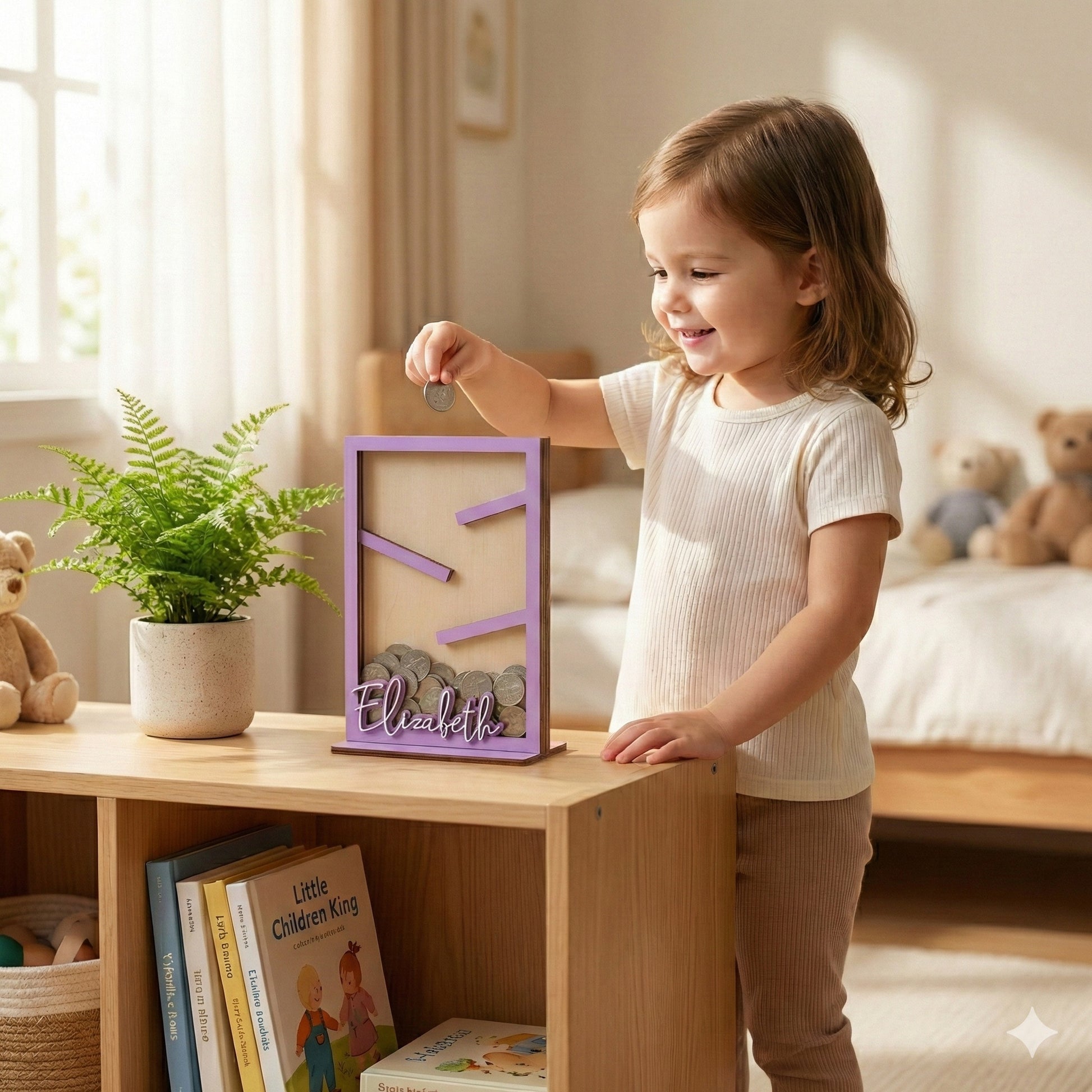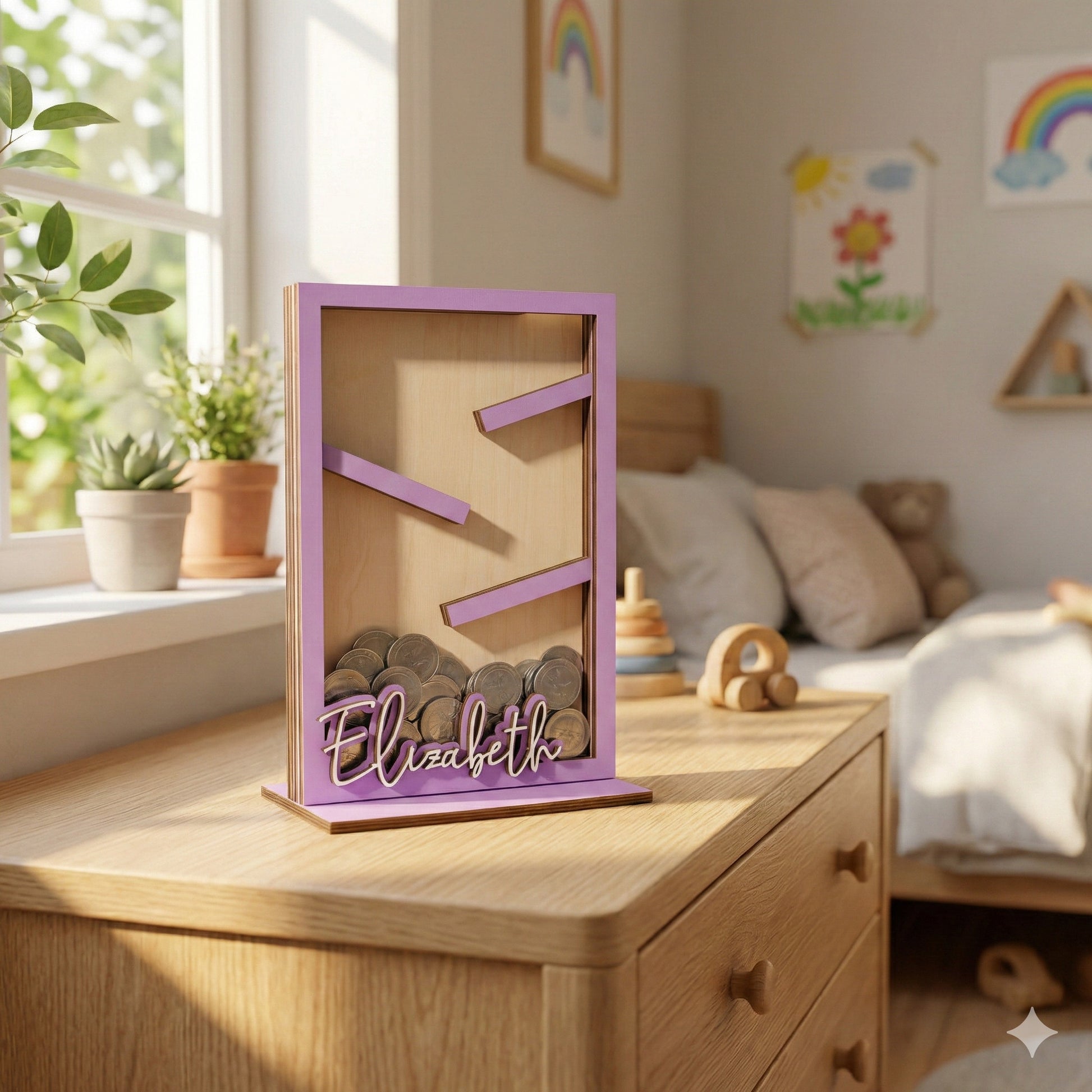 Made entirely from wood, this wooden piggy bank box fits naturally on tables in kids rooms, bedrooms, or living rooms. Its simple design complements boho, Scandinavian, eclectic, or modern interiors while keeping the space warm and personal.