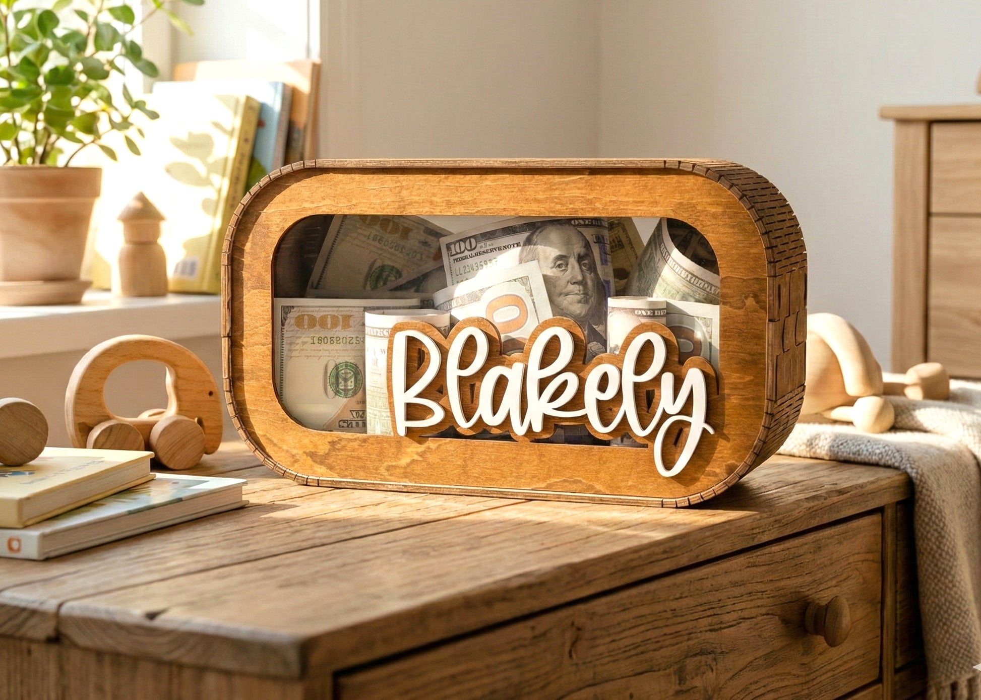 This personalized wooden piggy bank is designed as a decorative money box that helps kids save paper money while adding a warm and personal touch to their space. Featuring a rounded shape with a clear front and custom name detail, it allows children to easily see their savings grow.