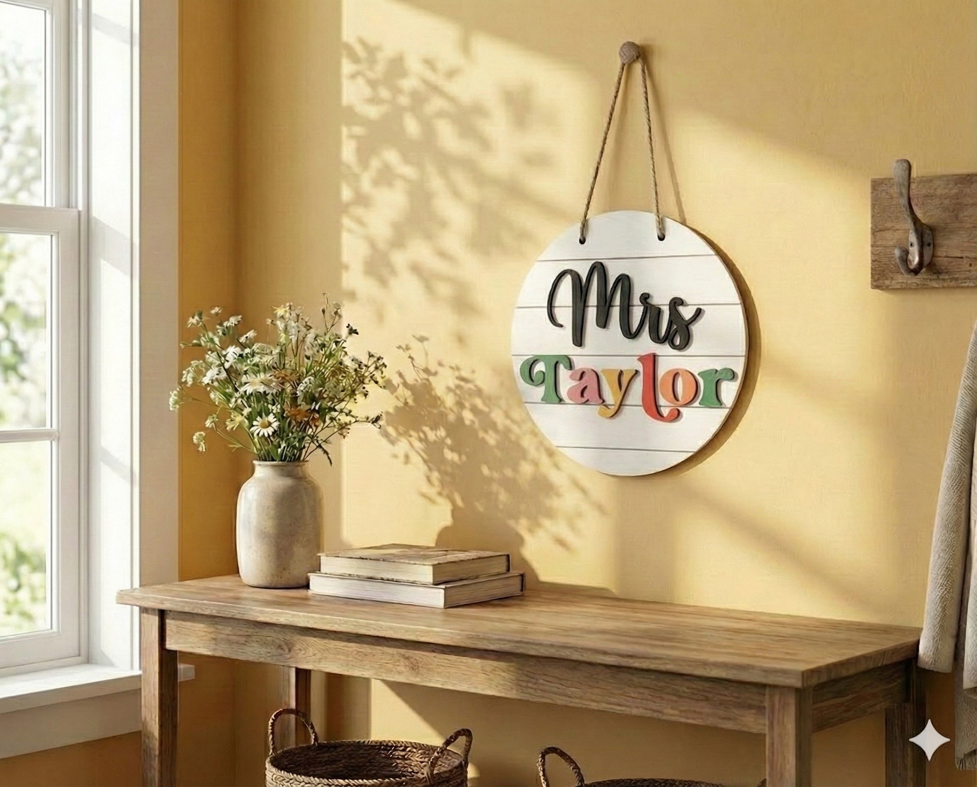 Designed as a personalized teacher gift, this hanging sign suits educators who enjoy warm details and simple design. The round shape brings balance and charm while fitting naturally into boho, rustic, or minimalist interiors.