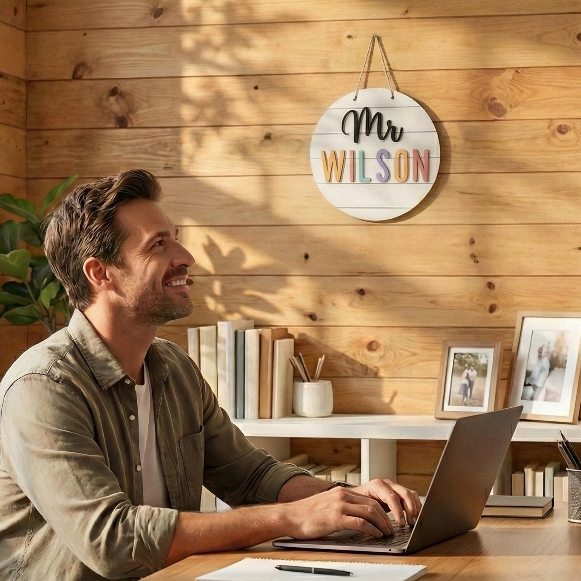 This personalized wooden teacher name hanging sign is a round decorative nameplate created to highlight and celebrate teachers. Made from wood and customized with a teacher’s name, it adds a soft and welcoming touch as teacher wall decor for classroom walls or doors.